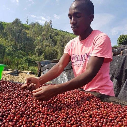 ルワンダはアフリカ東部に位置し、「千の丘の国」と呼ばれるほど、山や丘の多い国です。小高い場所に登れば、緑の絨毯をしきつめたような美しい山並みが連なります。このコーヒーが生まれたのは、そんな自然豊かな西部のマチアゾ地区。